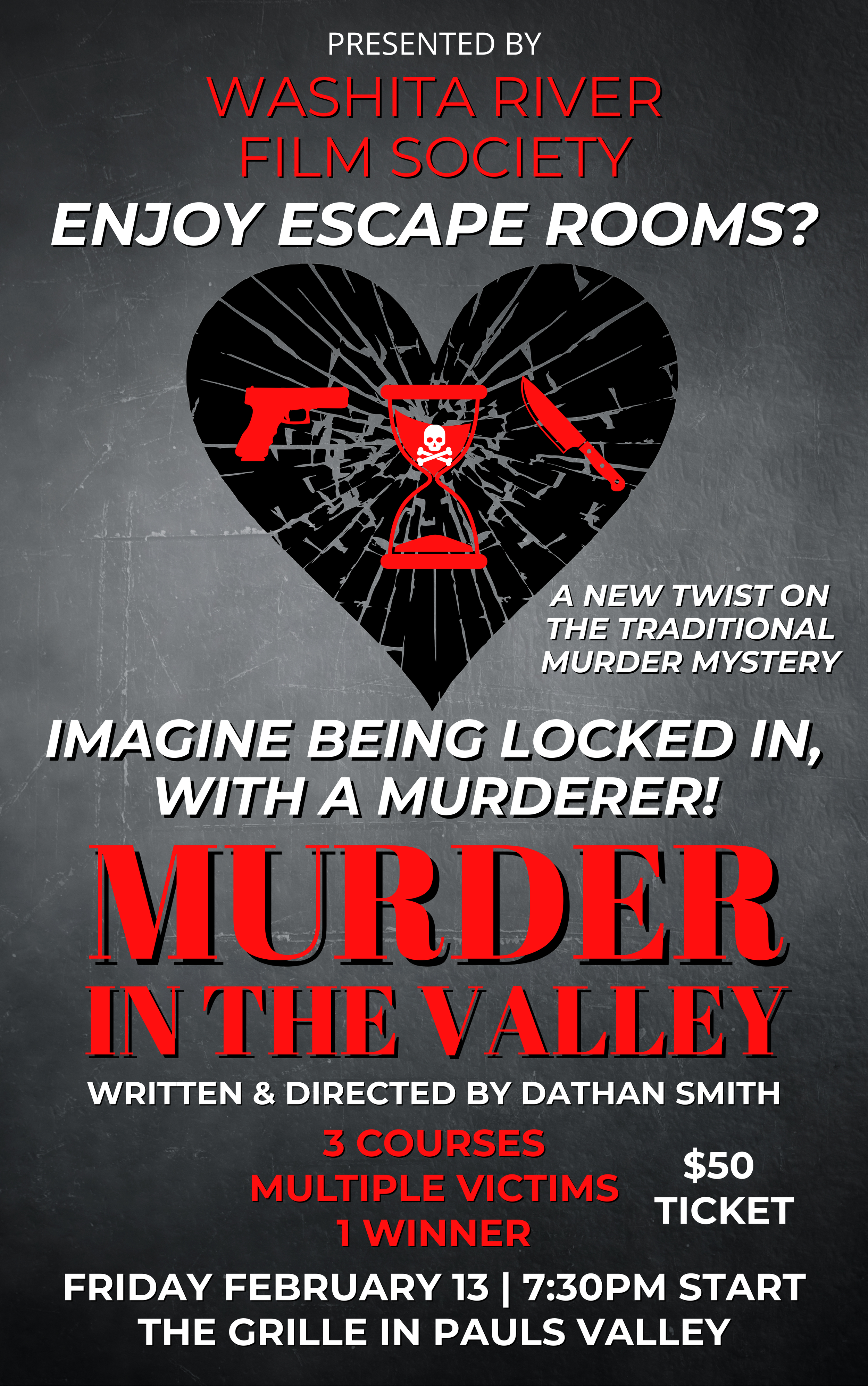Join us for a thrilling night of suspense, secrets, and surprises at Murder in the Valley on Friday, February 13, 2026 at 7:30 PM at The Grille in Pauls Valley. Presented by the Washita River Film Society, this immersive murder mystery experience unfolds over a delicious three-course meal, with guests helping uncover the truth as the drama plays out around them.